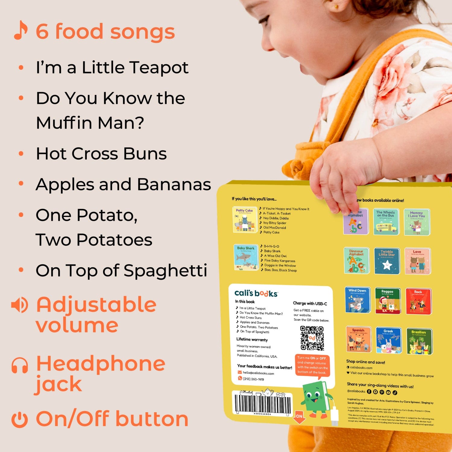 This educational musical book uses nursery rhymes to help children learn about food in a fun way. The book builds a positive relationship with food while familiarizing kids with long vowels sounds. It also sharpens their vocabulary, spatial memory, and pronunciation skills. Songs featured include: Apples and Bananas, Do You Know The Muffin Man?, Hot Cross Buns, I'm a Little Teapot, One Potato, Two Potatoes, and On Top Of Spaghetti.