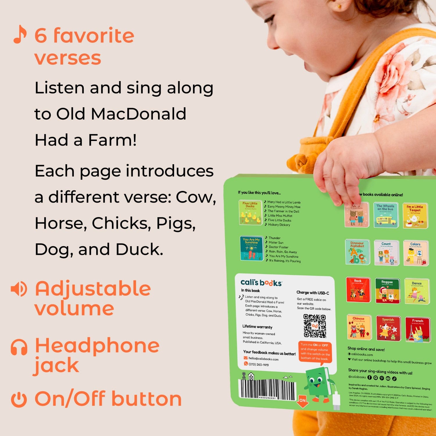 Inside the book, you will find 1 sound button on every page, 15 seconds of music, charming illustrations, song lyrics, and lots of fun!